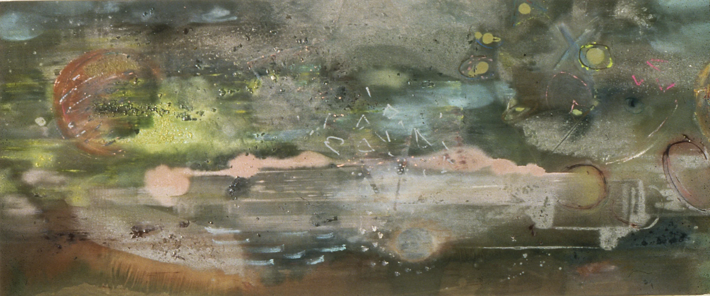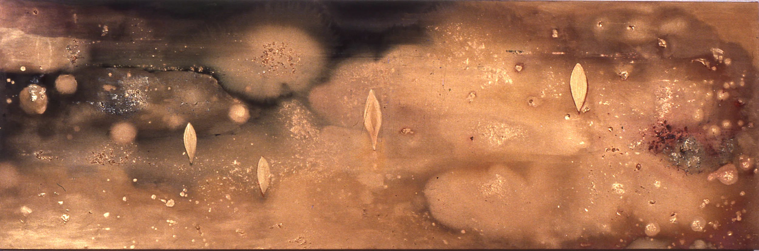 Io, New Findings Inside, 1985, acrylic, iridescent pigment, rhoplex on canvas, 60" x 156"'