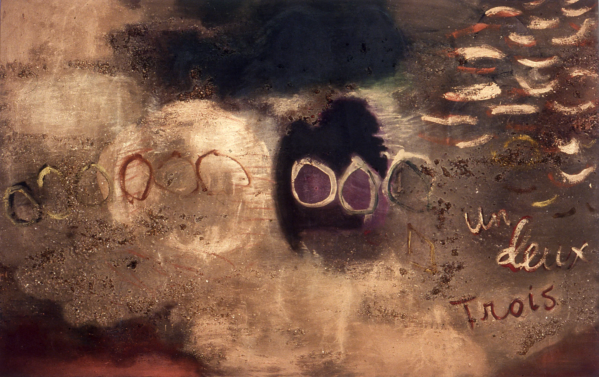 FROM THE CAVE, 1987, acrylic, polymer resin, mica, collage on canvas, 72" x 94"